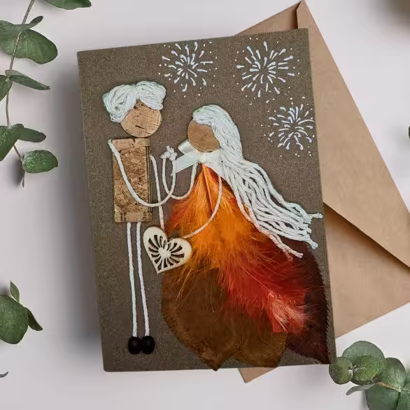 Handmade Personalised Anniversary cards incorporate beautiful feathers, leaves, cork, wood, and thread. They are unusual.
