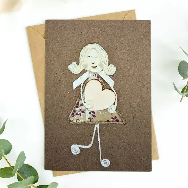 This Beautiful Card for Any Occasion features a smiling girl holding a wooden heart. The card is blank inside so that you can write your personal message. The card is made of reusable materials and will be a cherished keepsake. This handmade card is perfect for any occasion but would be significant for Mater’s Day, Father’s Day, Valentine’s Day, an anniversary, or a birthday. It is also a great way to show someone you care.