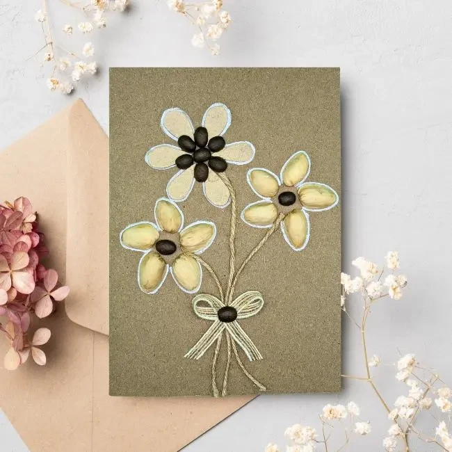Every detail of this Handmade Thank You Card for Mum or Dad is thoughtfully designed to convey your deepest gratitude with an extra touch of warmth and affection. This card is a true testament to artistry, featuring exquisite, delicate flowers meticulously crafted from natural pistachio shells and enhanced with realistic moss for texture and vibrancy.